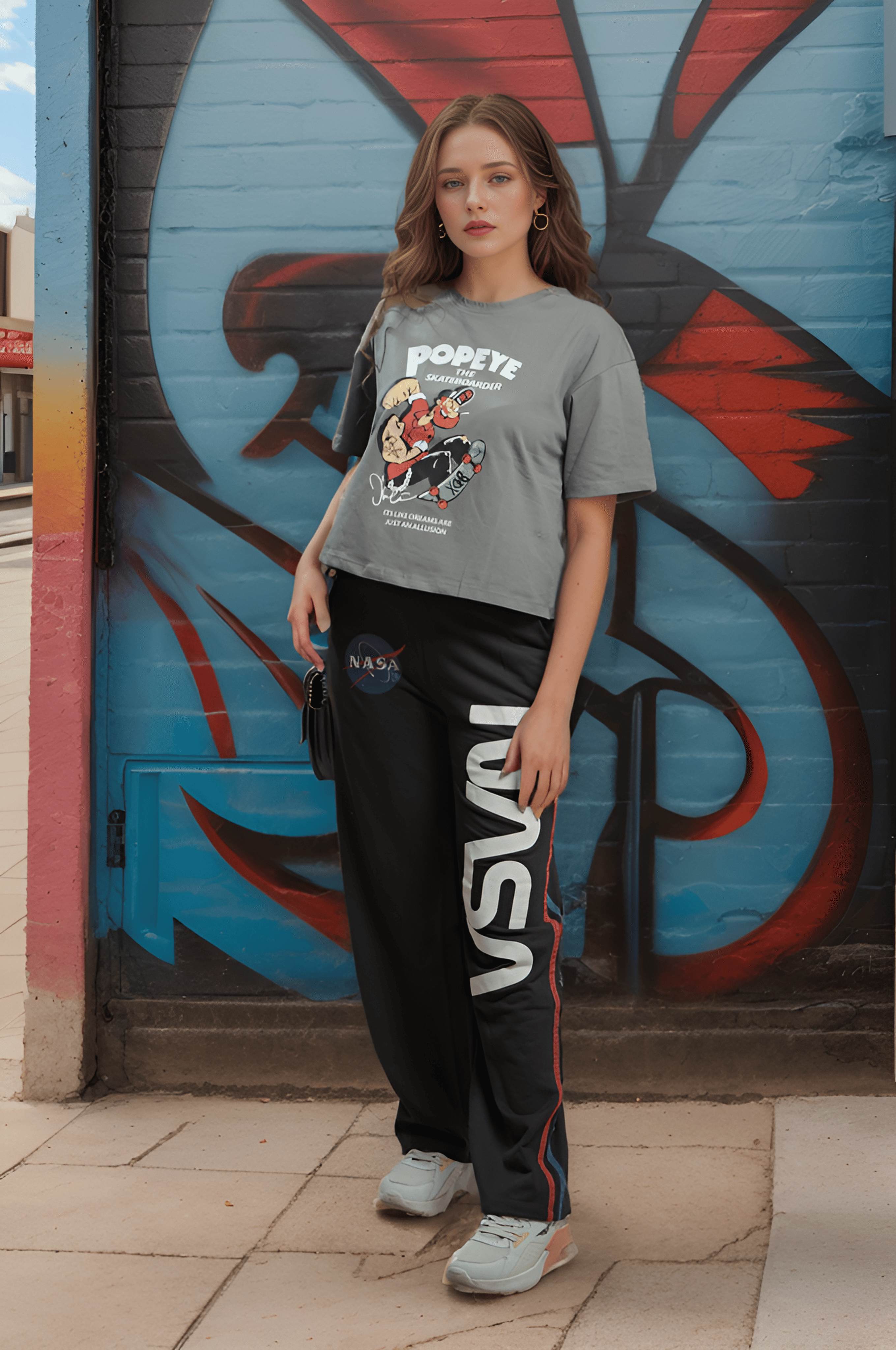 - Features a bold Popeye the Skateboarder graphic with a nostalgic comic-style print