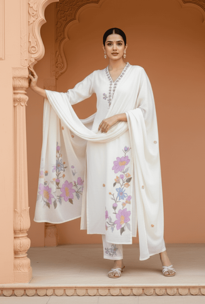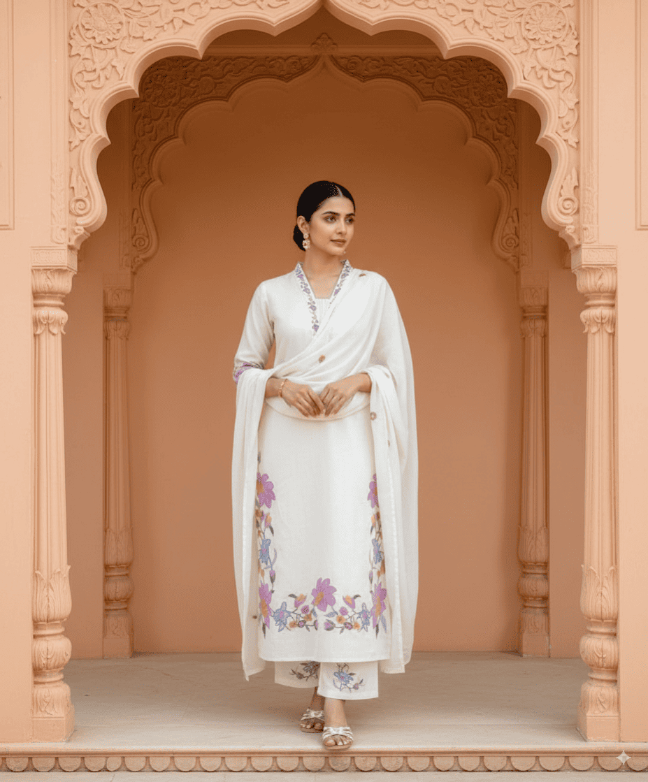 Monochromatic Grace: The silhouette is a study in elegance, featuring a classic straight-cut kurta and coordinating trousers tailored from the same serene ivory fabric. This monochromatic base elongates the frame and allows the colourful embroidery to take centre stage.