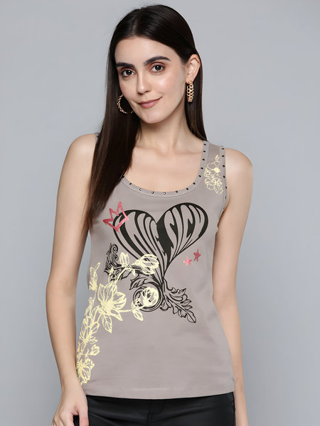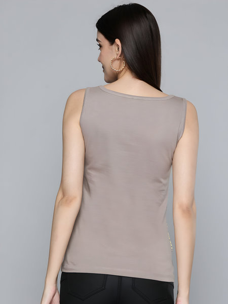 - Top Style: Sleeveless scoop-neck tank top with studded details along the neckline