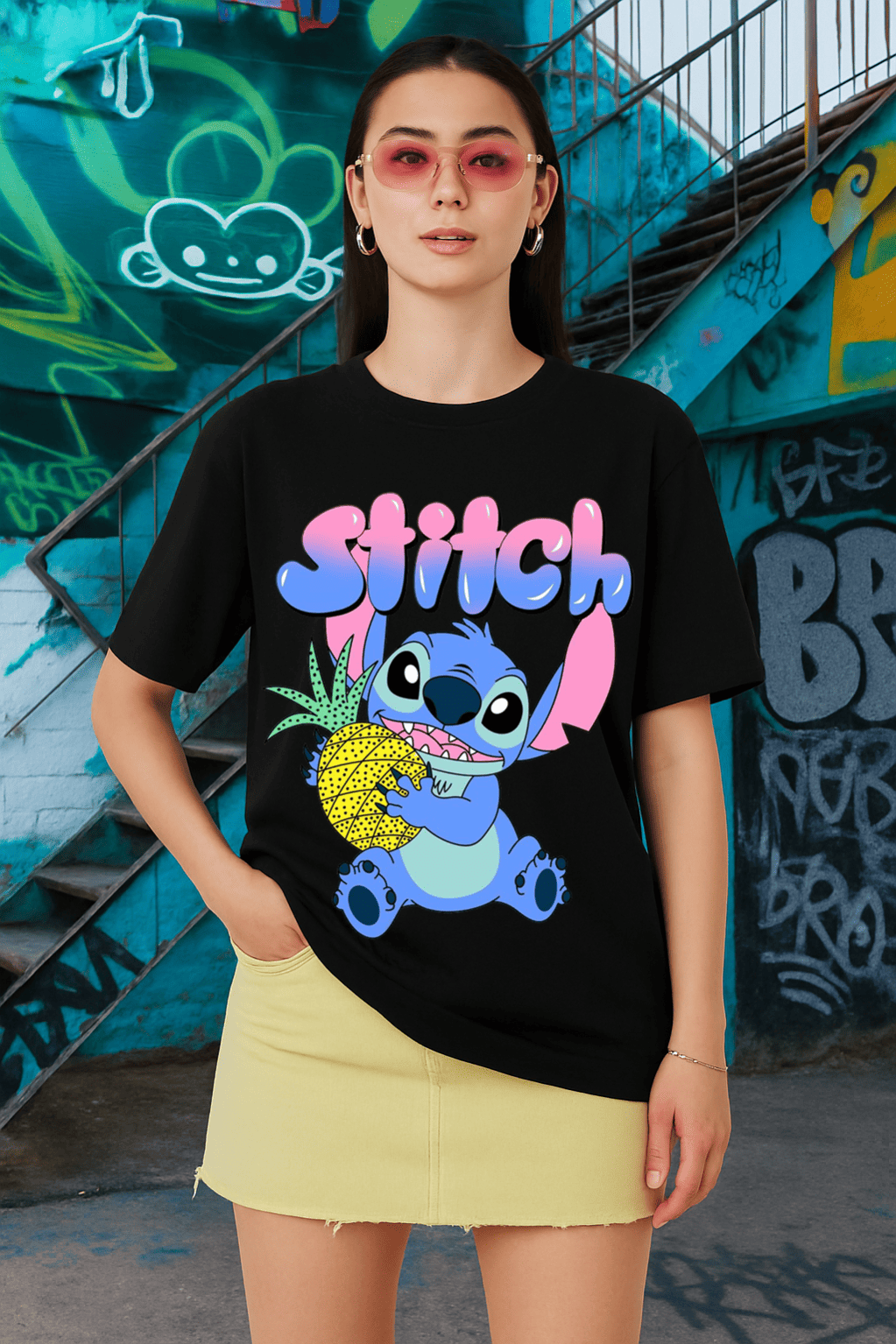 Graphic Design: Vibrant cartoon-style Stitch character holding a bright yellow pineapple