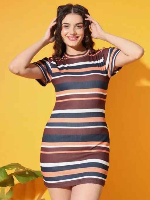 - Design: A fun and stylish striped mini dress featuring horizontal stripes in shades of brown, navy, peach, and white for a retro-chic vibe.
