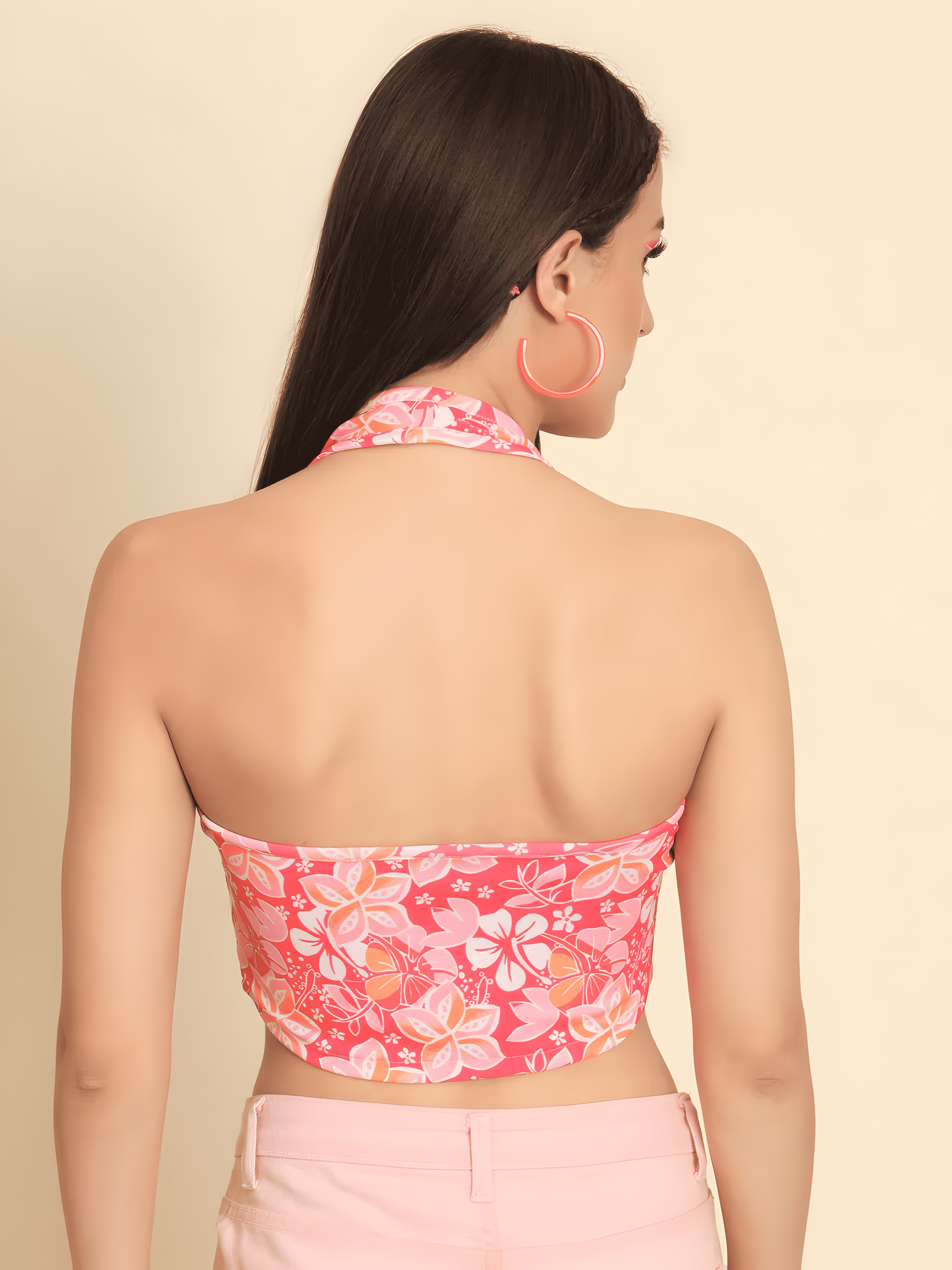 - Top Style: Sleeveless halter crop top with a vibrant floral print