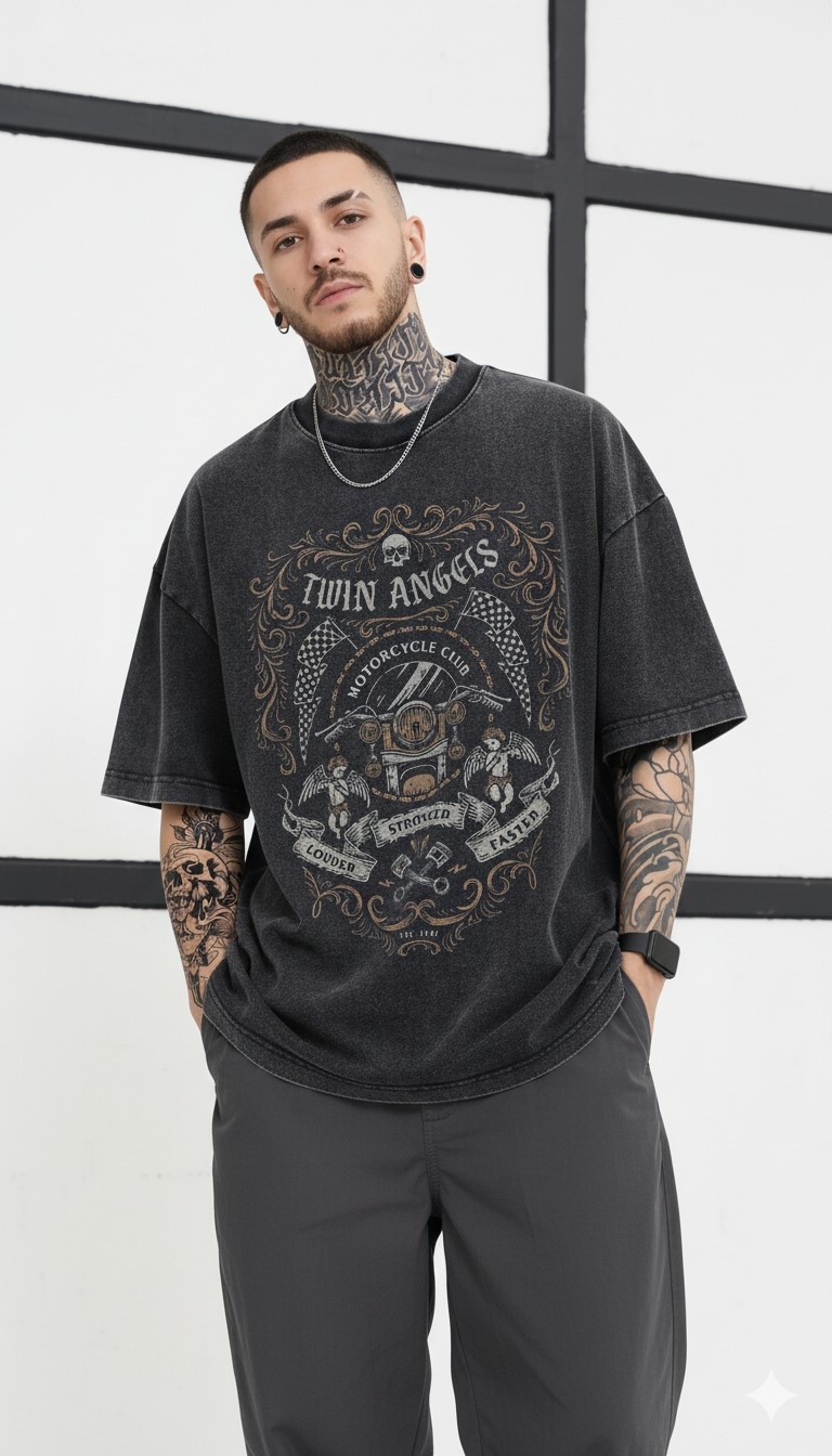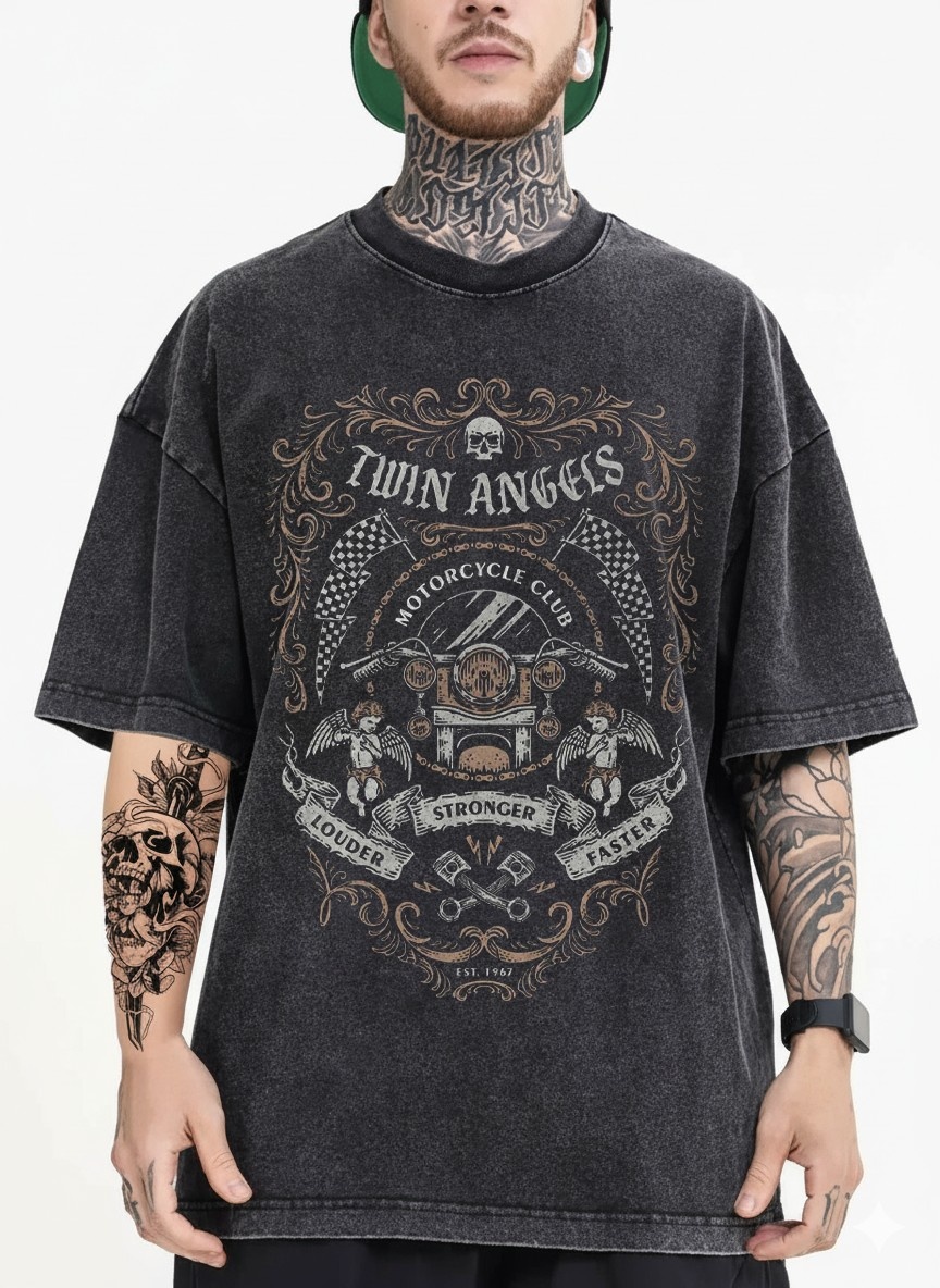 - Classic Rider Spirit: Rev up your style with the "Twin Angels: Motorcycle Legends" oversized T-shirt, featuring a vintage motorcycle flanked by guardian angels and a checkered flag that embodies the soul of the open road.