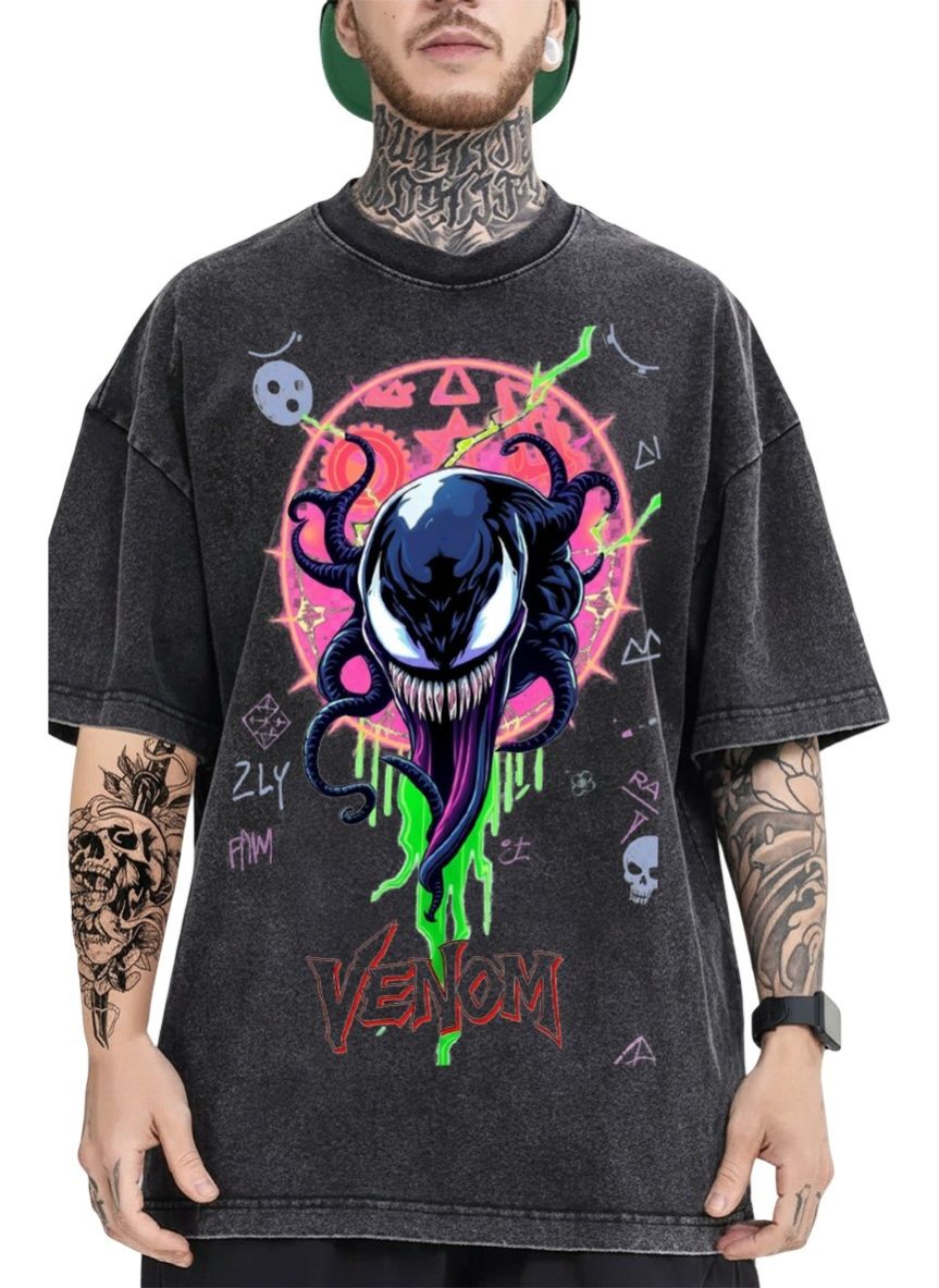 - Features a striking graphic of the iconic Venom character with a menacing face, dripping green slime, surrounded by vibrant pink and neon accents, exuding a bold, otherworldly vibe.
