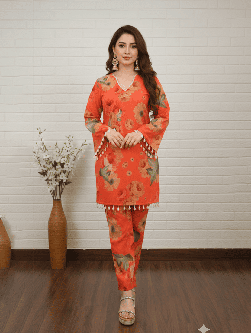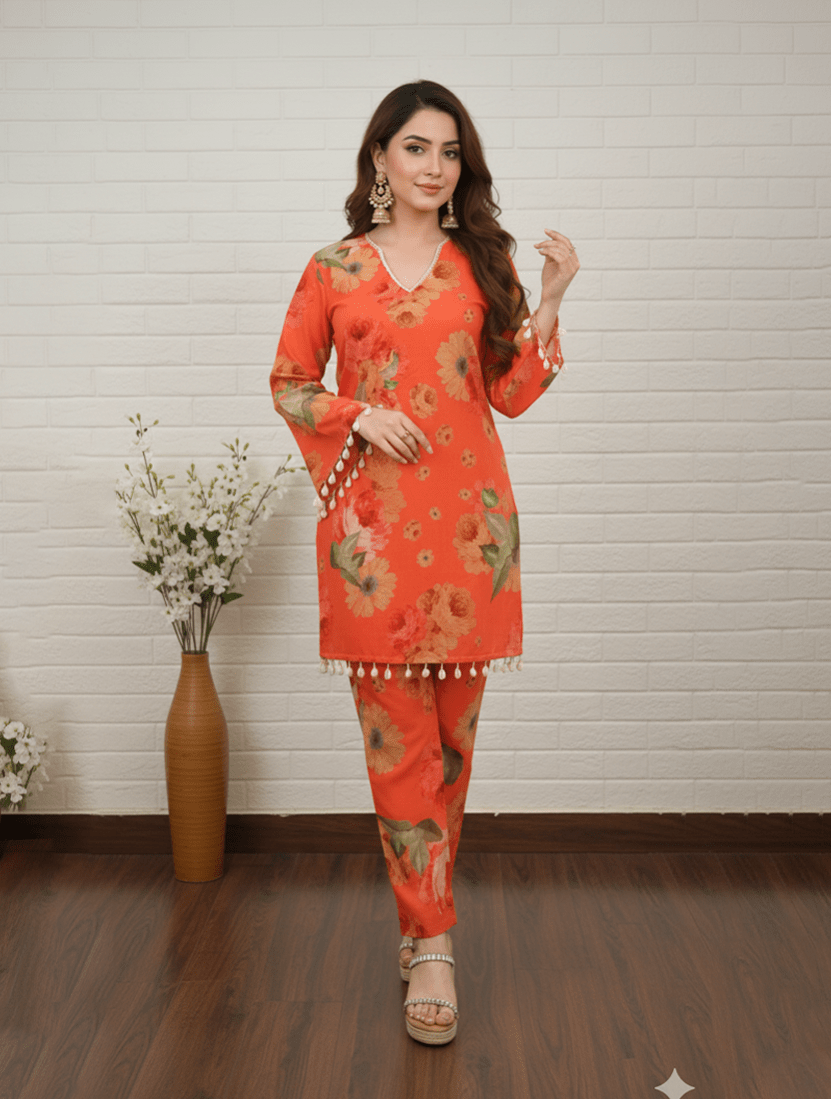 Vibrant Orange Floral Salwar Kameez with Pearl Details