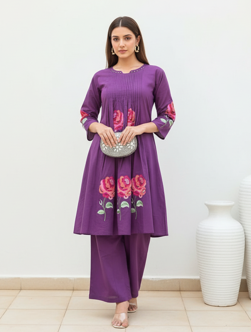 Vibrant Purple Angrakha-Style Kurta Set with Hand-Painted Rose Motifs
