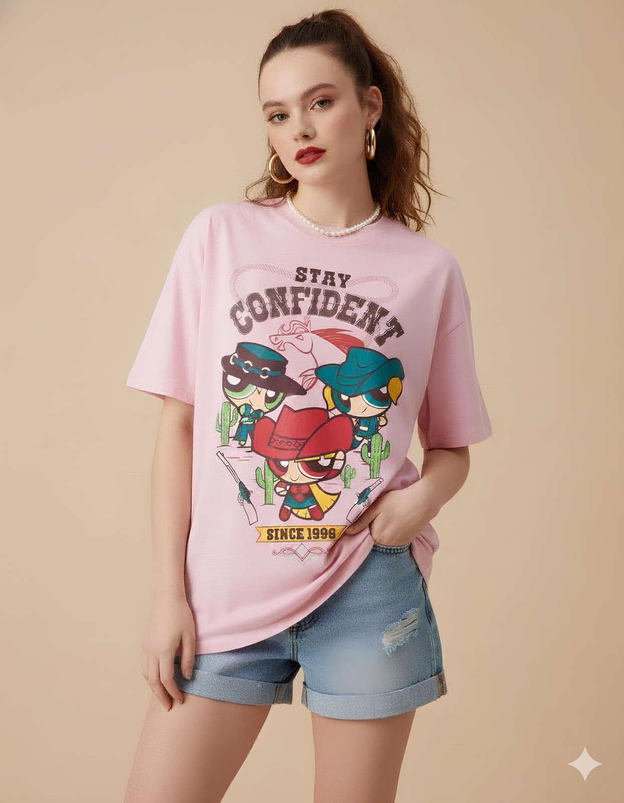 Women’s Oversized Pink Graphic T-Shirt – “stay confident” Cartoon Print Casual Tee