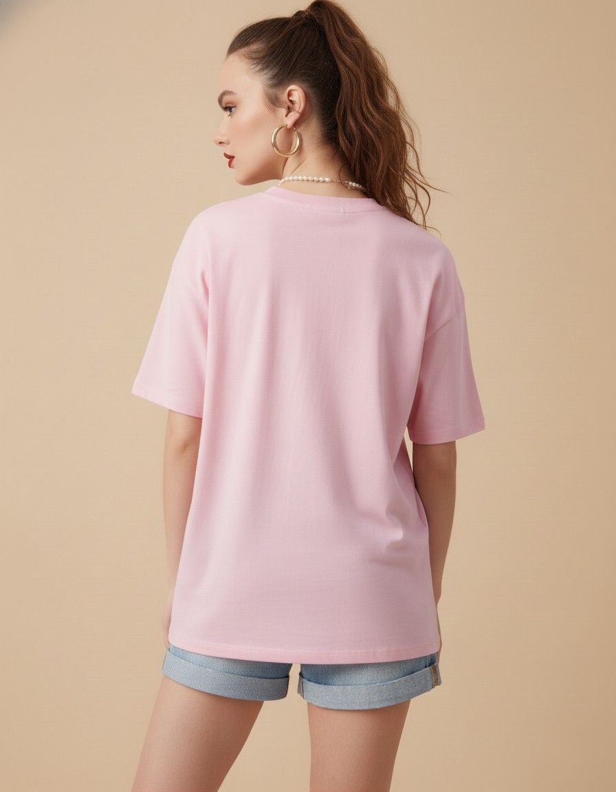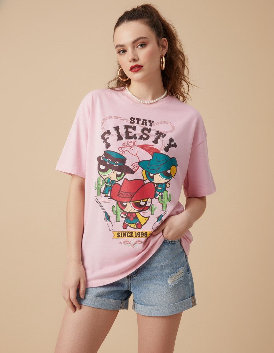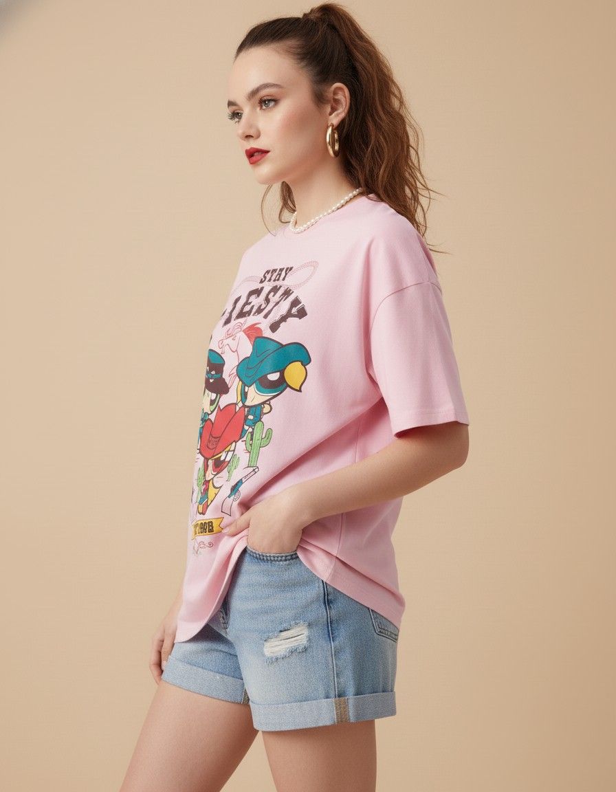 Women’s Oversized Pink Graphic T-Shirt – “Stay Fiesta” Cartoon Print Casual Tee